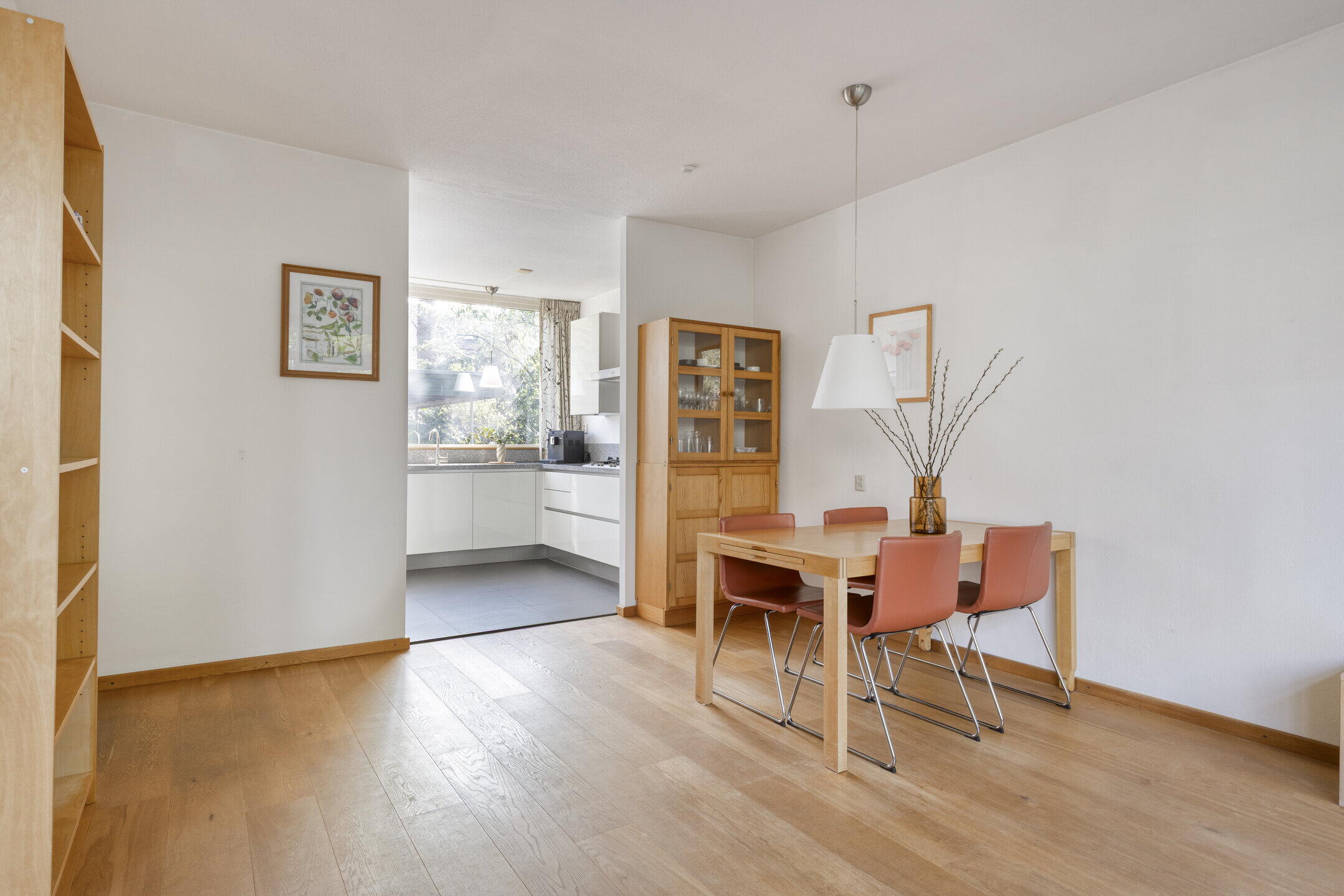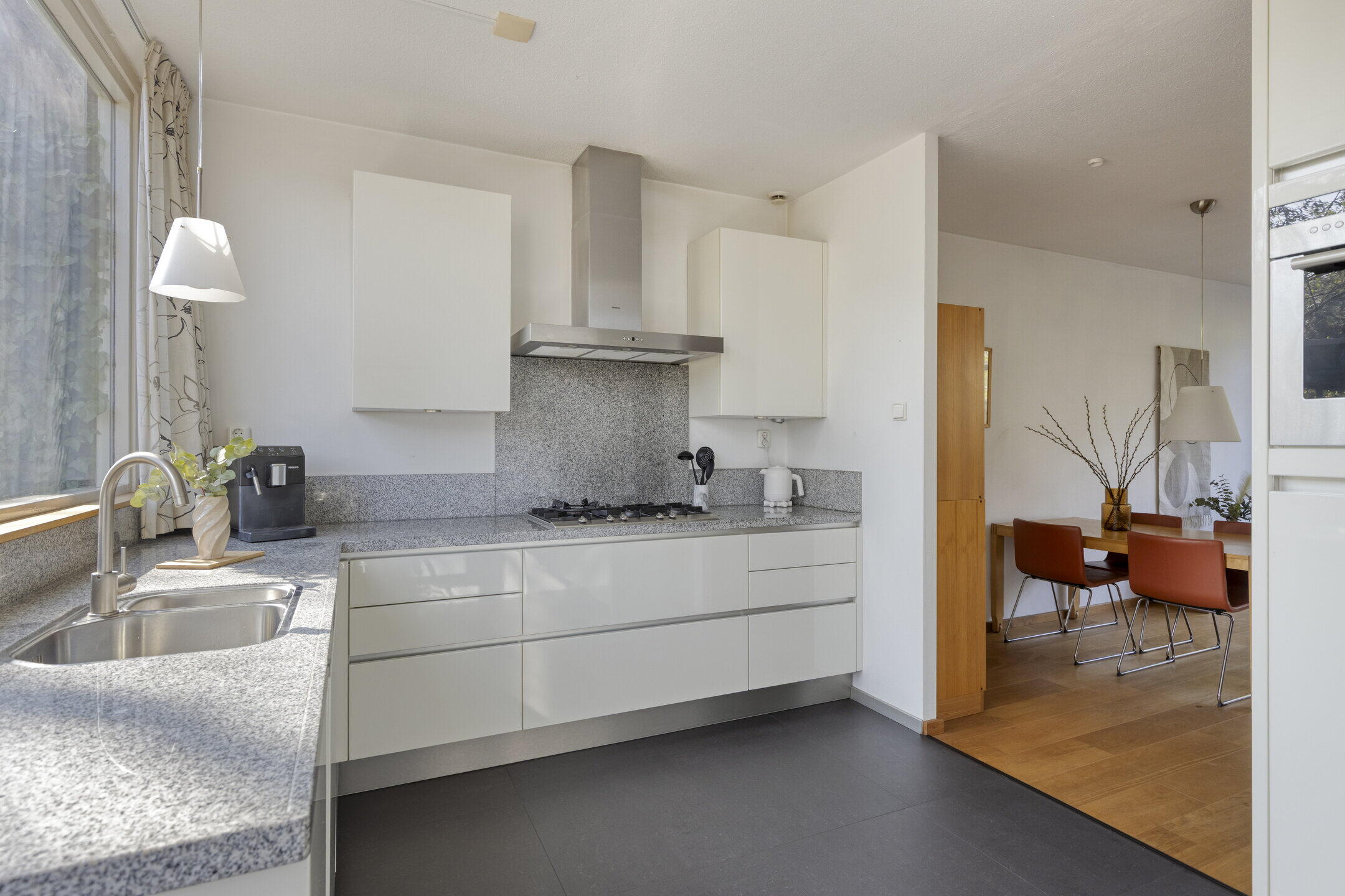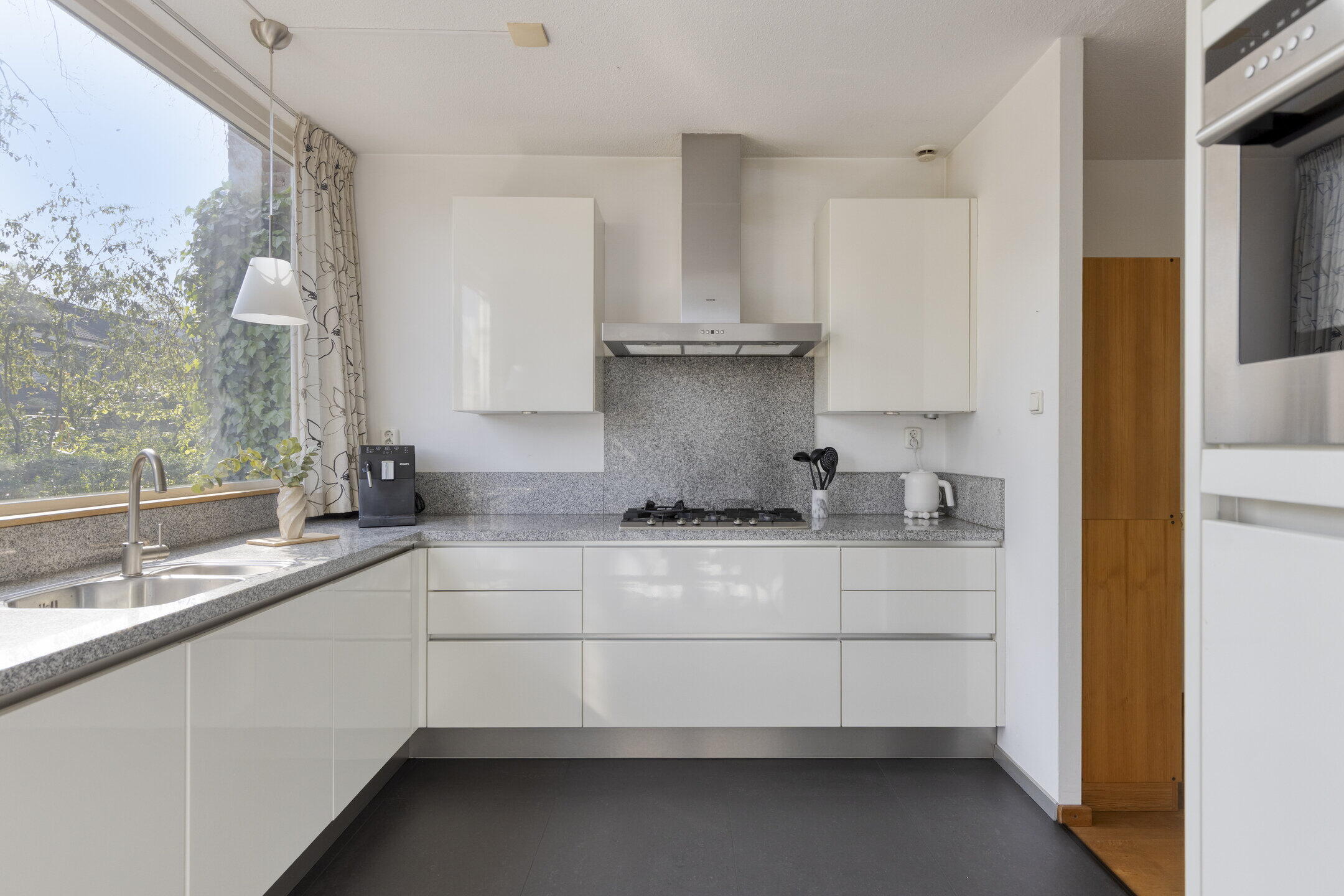 Aan de voorzijde is de open keuken gesitueerd. Ook de keuken is lekker licht en zeer royaal te noemen, zowel qua oppervlak alsook qua kastruimte. Vanuit hier kijk je uit over de voortuin en kun je tegelijk contact houden met familie en vrienden in de woonkamer. De uitgebreide inrichting in lichte kleurstelling bestaat uit een hoekopstelling met veel kastruimte en lades en ingebouwde 5-pits gaskookplaat, afzuigkap en natuurlijk een vaatwasser. Daarnaast is er een separate wandopstelling waar de combi-oven, koelkast en vriezer gecombineerd worden met nog meer kastruimte.