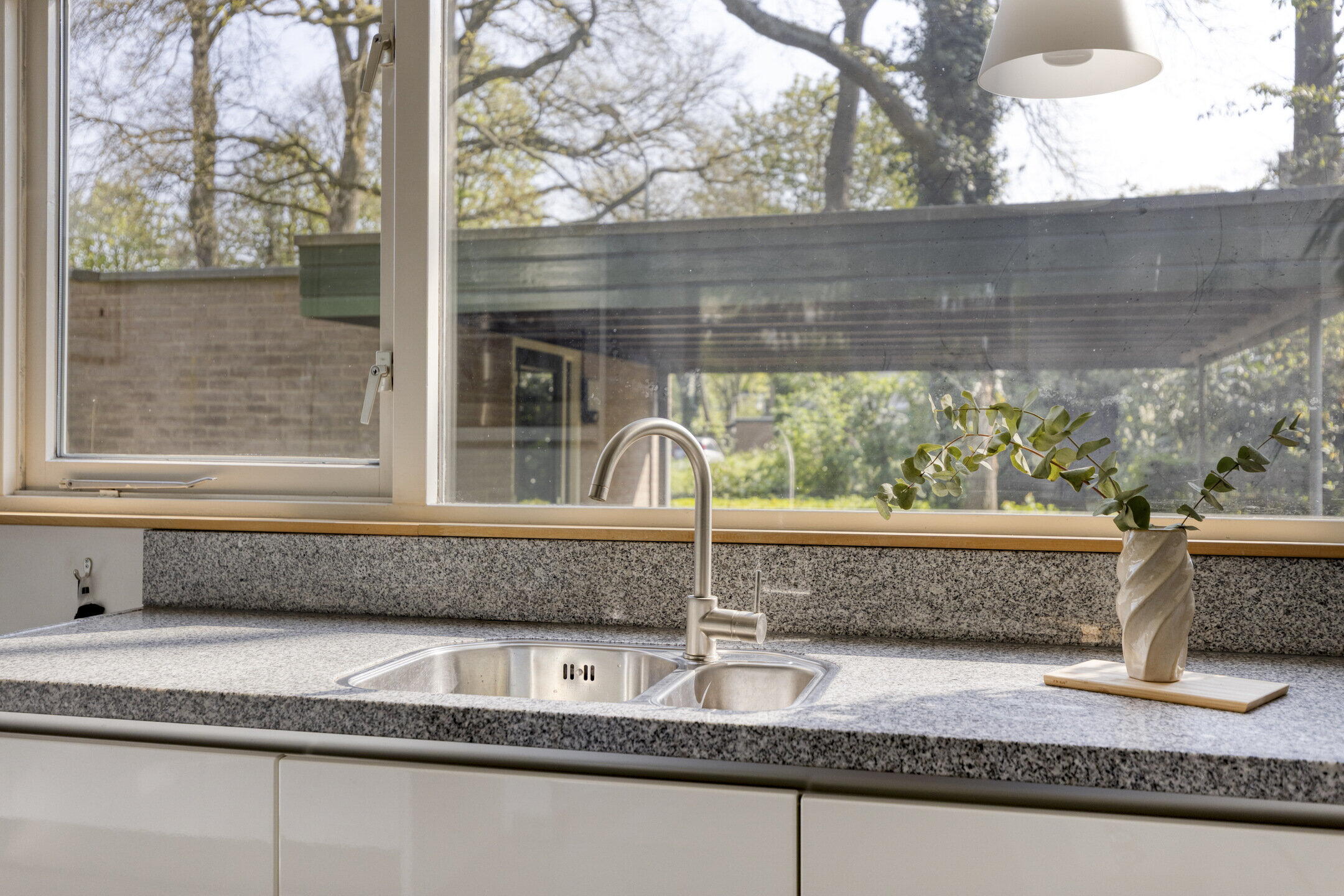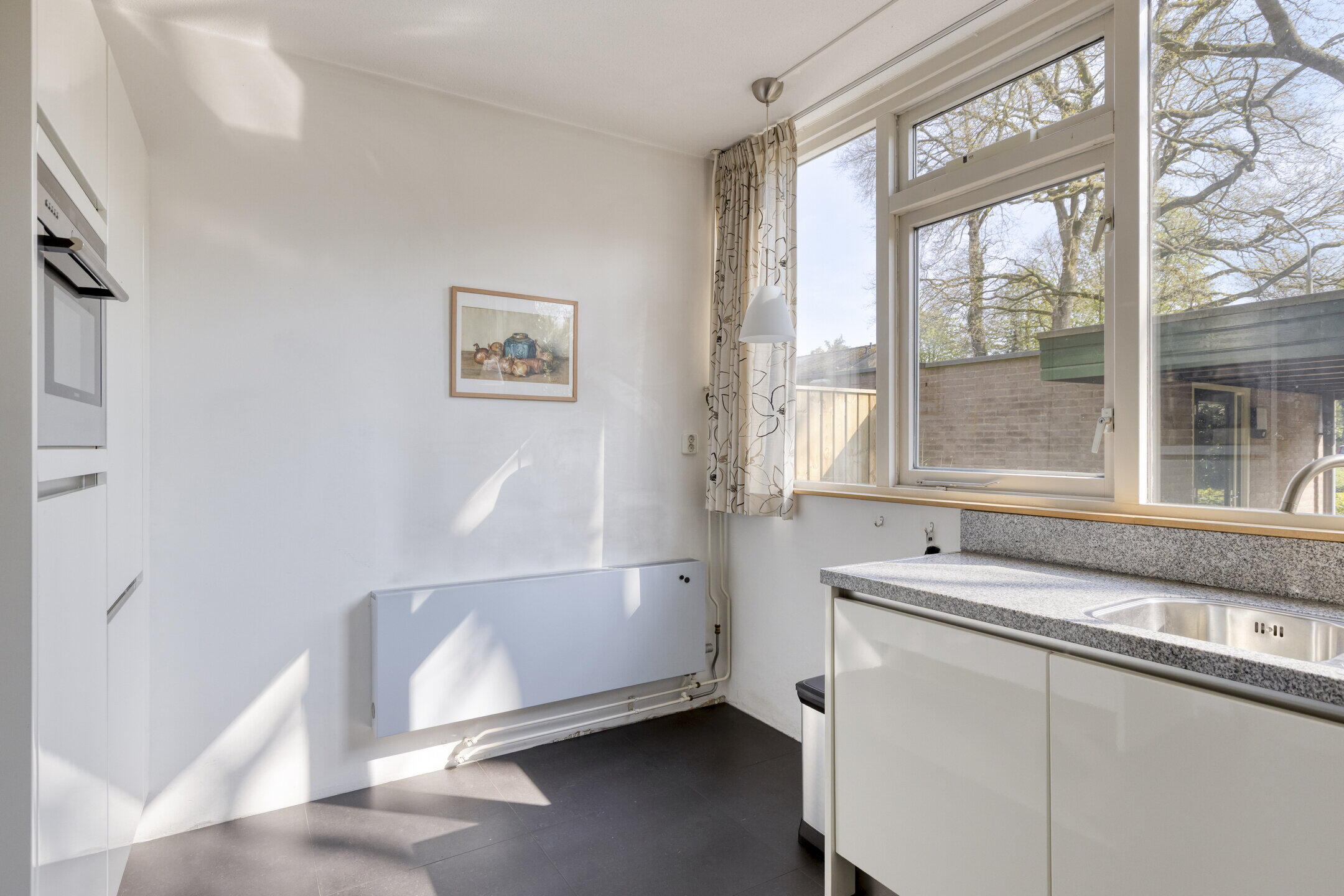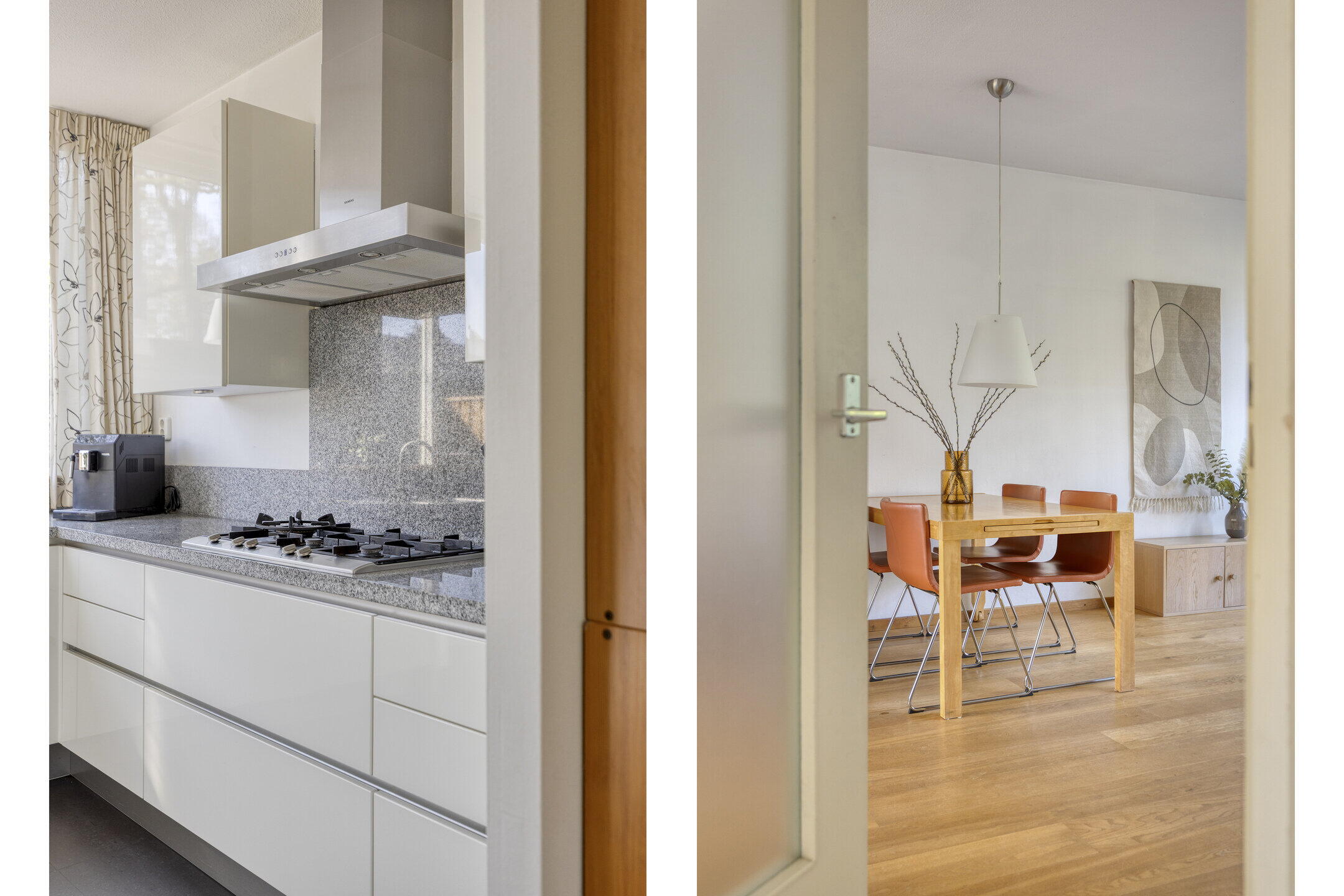 Aan de voorzijde is de open keuken gesitueerd. Ook de keuken is lekker licht en zeer royaal te noemen, zowel qua oppervlak alsook qua kastruimte. Vanuit hier kijk je uit over de voortuin en kun je tegelijk contact houden met familie en vrienden in de woonkamer. De uitgebreide inrichting in lichte kleurstelling bestaat uit een hoekopstelling met veel kastruimte en lades en ingebouwde 5-pits gaskookplaat, afzuigkap en natuurlijk een vaatwasser. Daarnaast is er een separate wandopstelling waar de combi-oven, koelkast en vriezer gecombineerd worden met nog meer kastruimte.