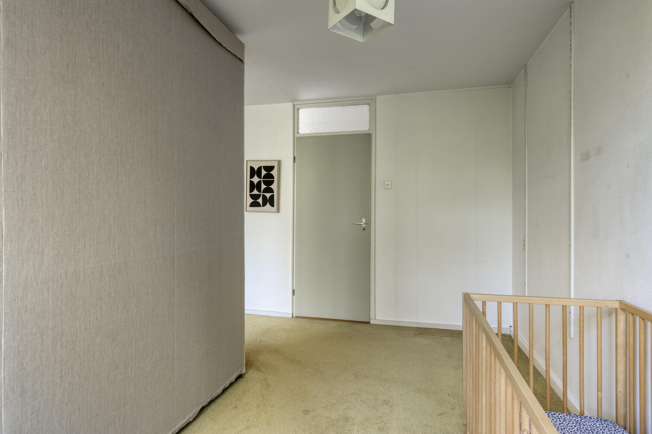Eerste verdieping: overloop met vaste bergkast. Thans zijn er twee slaapkamers maar in de originele opzet zijn het er drie. Dit is eenvoudig terug te brengen door het plaatsen van een tussenwand aangezien de deuren vanuit de overloop nog aanwezig zijn.
